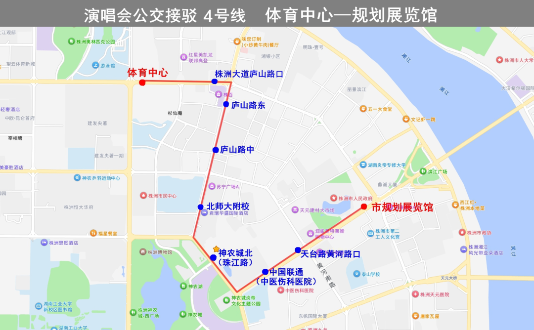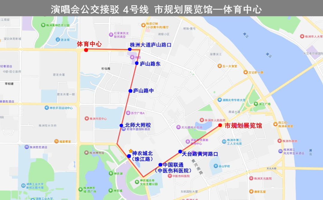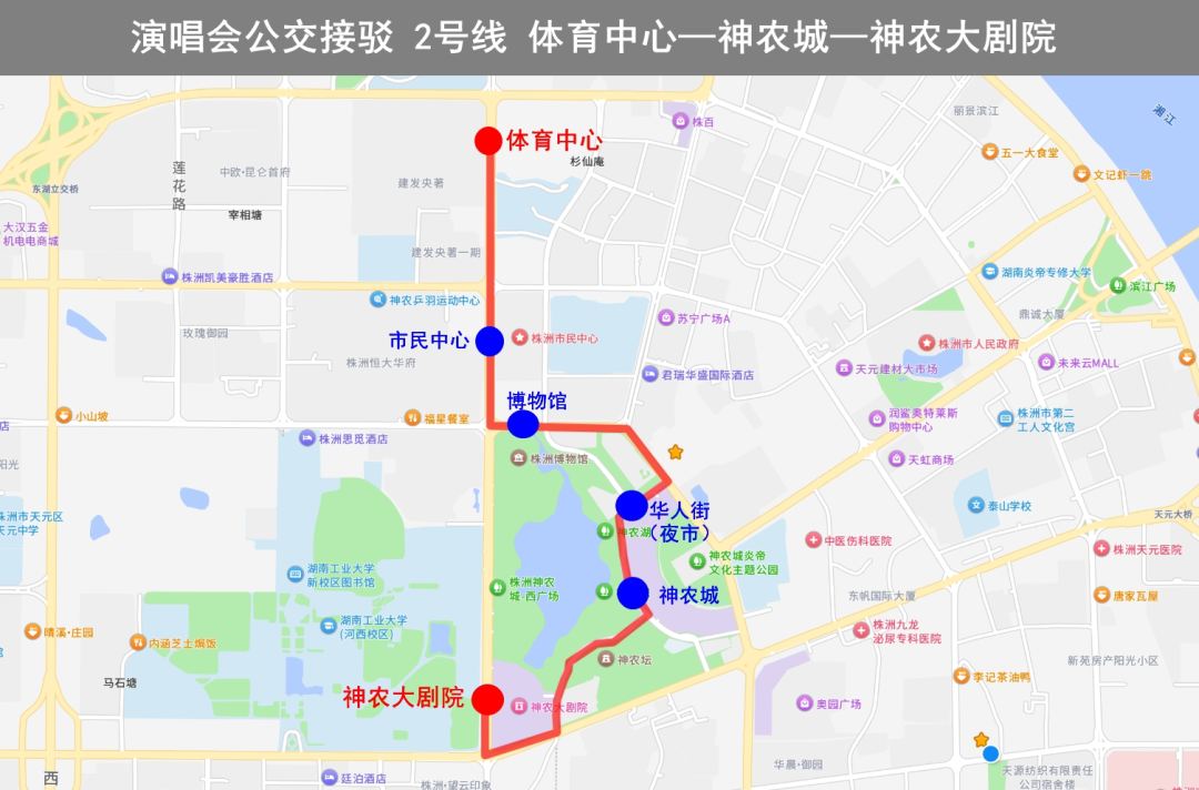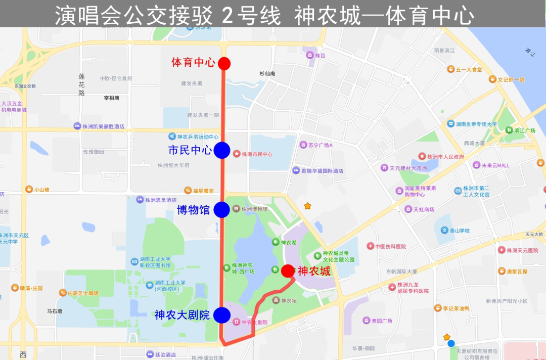 沿線??空军c(diǎn):神農(nóng)城(天易集團(tuán))、神農(nóng)大劇院、株洲博物館、市民中心、體育中心