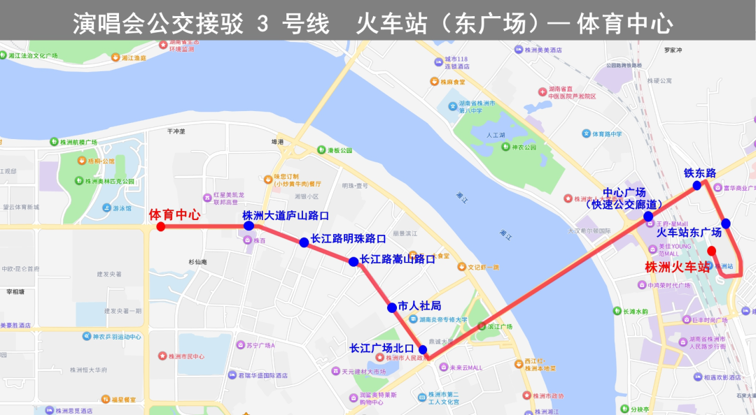 行駛路線:體育中心→株洲大道→隆興路→珠江北路→栗雨路→炎帝大道→株洲西站