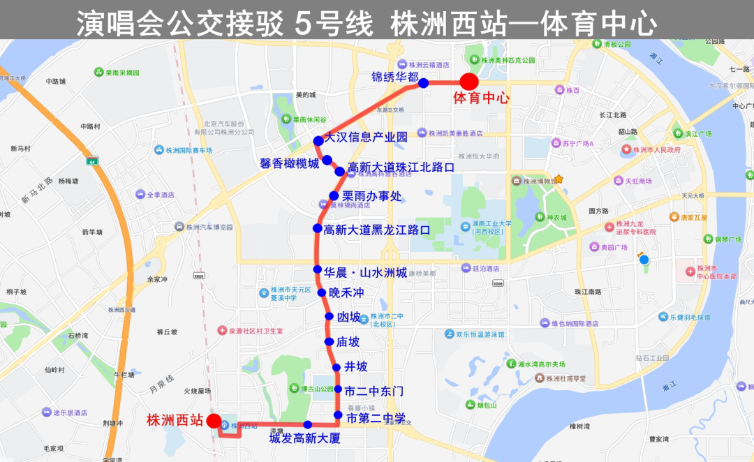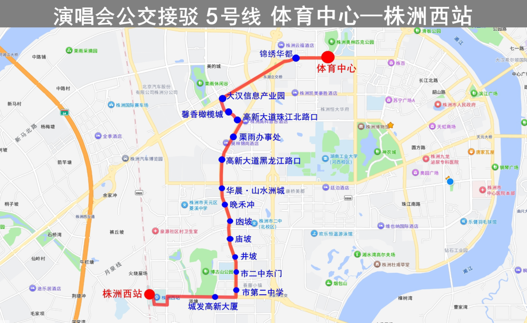 行駛路線:株洲西站→炎帝大道→栗雨南路→高新大道→珠江北路→株洲大道→體育中心