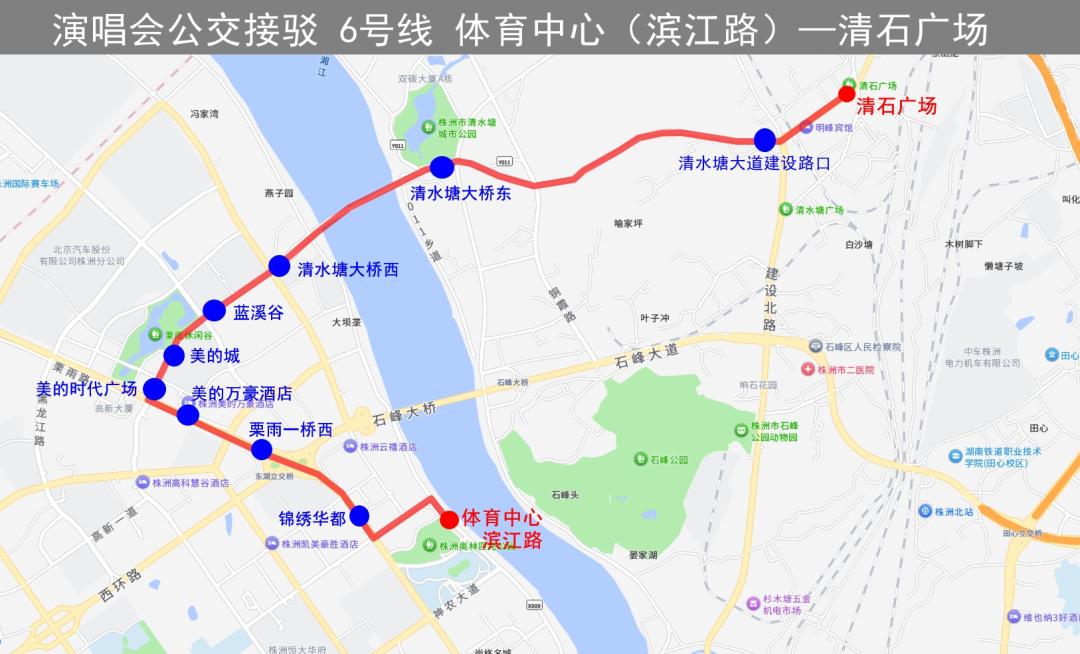 行駛路線:體育中心(濱江路)→株洲大道→隆興路→珠江北路(栗雨休閑谷)→清水塘大橋(八橋)→清水大道→建設(shè)北路→清石廣場