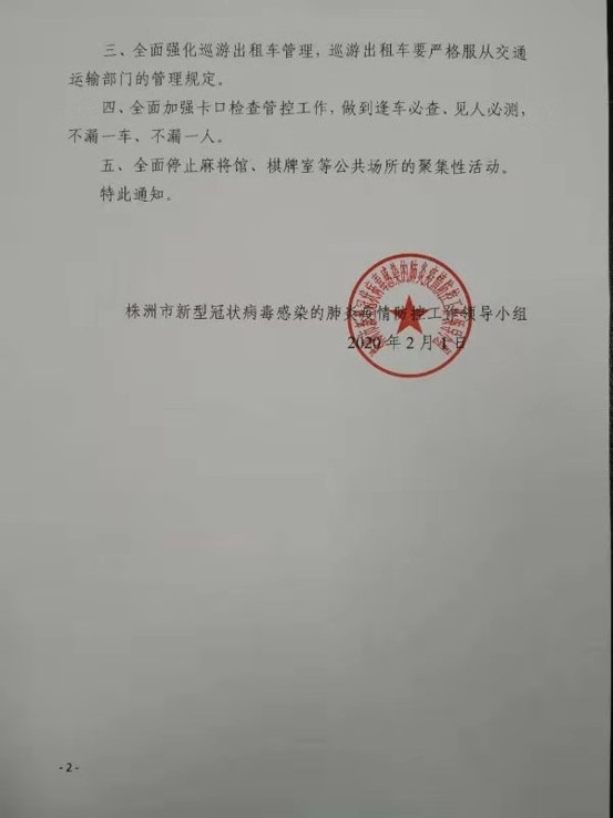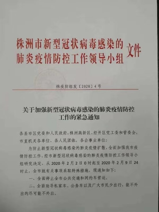 根據(jù)株洲市新型冠狀病毒感染的肺炎疫情防控工作領導小組2020年2月1日下發(fā)的《關于加強新型冠狀病毒感染的肺炎疫情防控工作的緊急通知》(株疫防組發(fā)〔2020〕4號)文件要求,為防止新型冠狀病毒感染的肺炎疫情擴散,全面加強我市疫情防控工作,從2020年2月2日0時起至2020年2月9日24時止,全面停止全市公共交通營運。